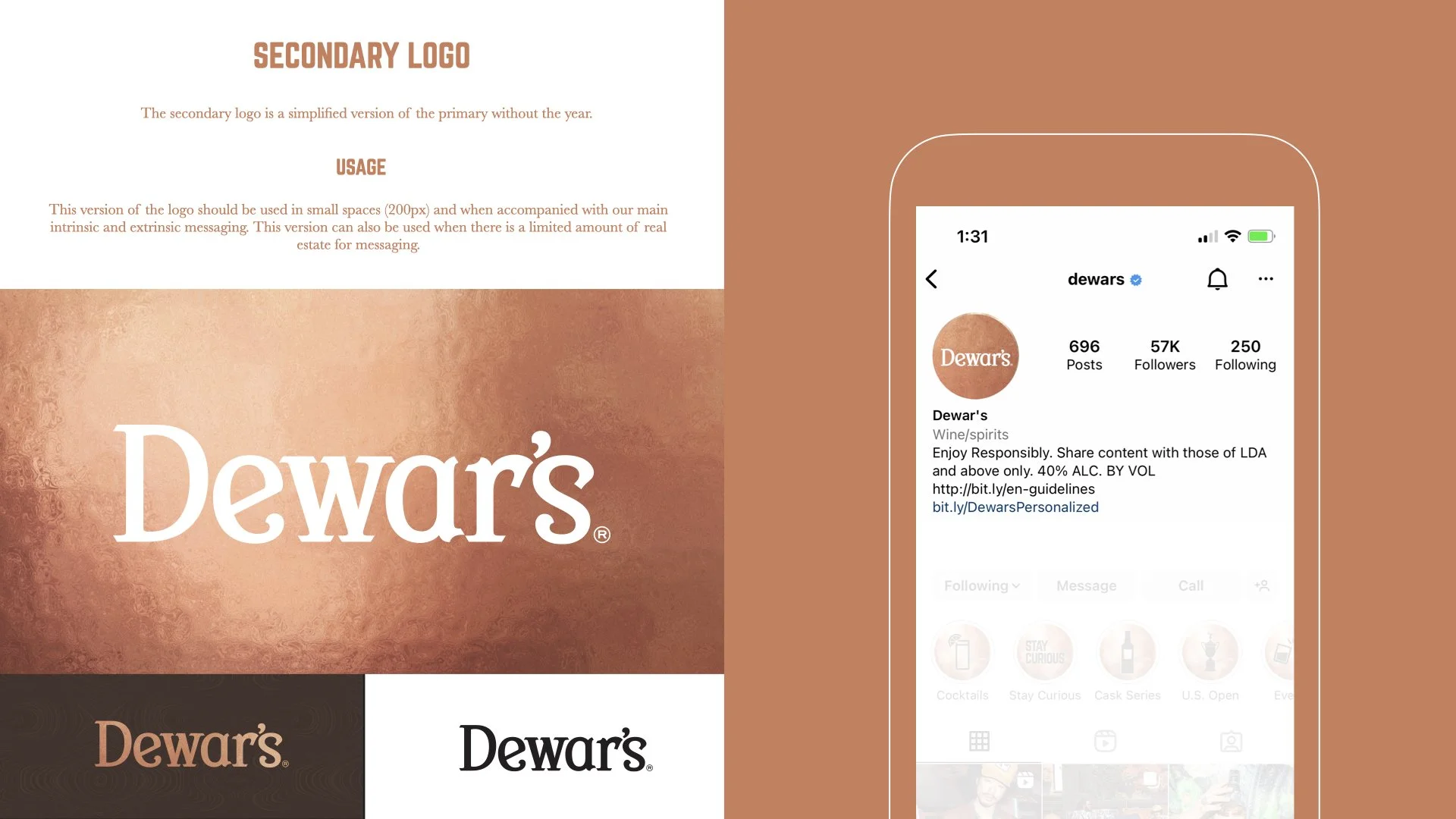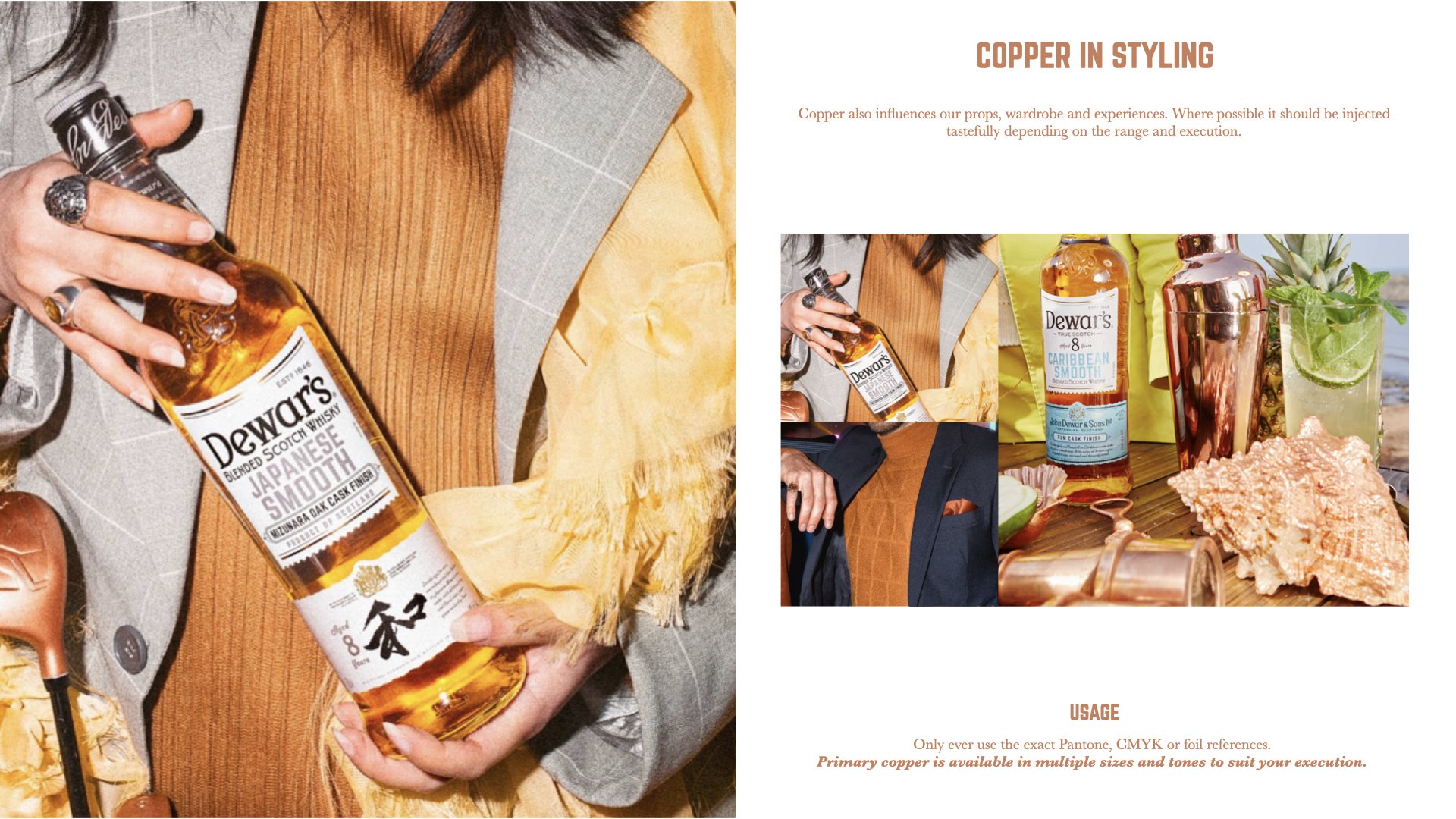 Our aim with the new Dewars brand book is to create synergy through Dewars, Cask, Core and Double Double Ranges. This was done by revamping the Dewar’s copper so that it could be versatile to work in different settings without becoming redundant. We stripped away all the extras and thoughtfully curated the brand back together. Giving purpose to their secondary typeface Baskerville and creating systems that can keep them consistent.